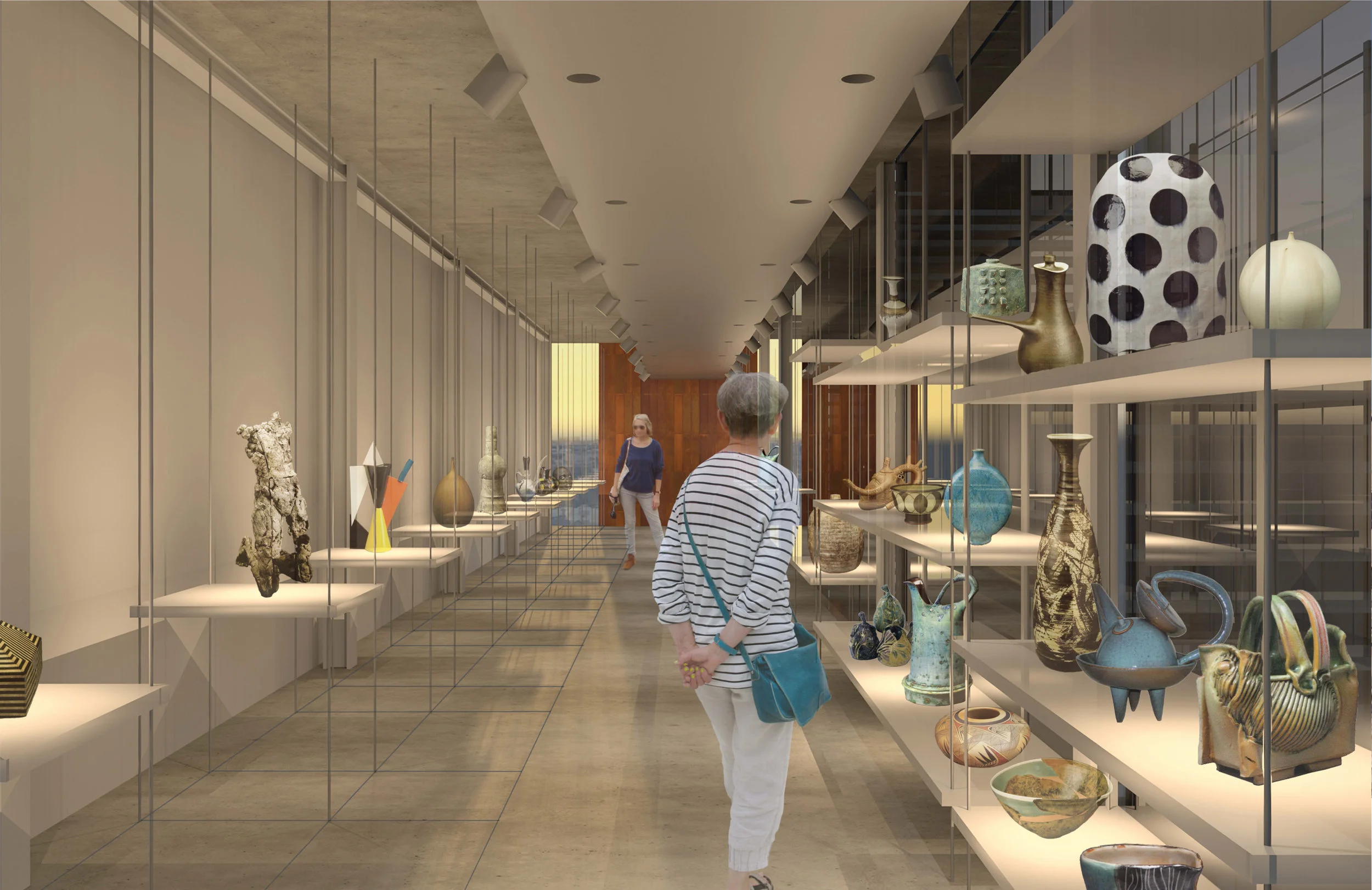 Ceramics have the unique ability to be exposed to natural sunlight, therefore the north 8 feet of this 23 foot wide Ceramics Research Center is made entirely of glass to let filtered light down through each floor. Additionally, the terraced form of this building allows for three outdoor patios which provide views down to Mill Avenue and out to “A” Mountain. Finally, the banner on the facade can be removed and the structure on the front allows for collaboration between the Research Center and local artists to display artwork on the facade.